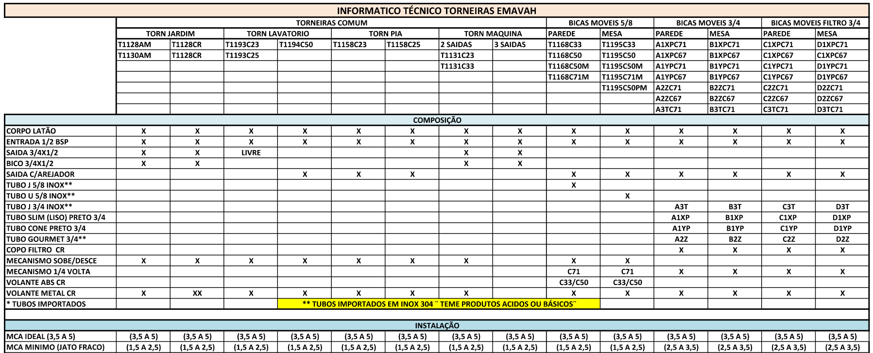 1- Obrigatório: tire as sujidades (resíduos da construção) da tubulação, principalmente em instalações novas, deixando a água correr livremente, certifique-se com uma rede de voal. 2- Feche o registro geral. 3- Limpe a conexão onde a torneira será instalada. 4- Aplique veda-rosca na torneira. 5- Rosquear a torneira evitando esforços desnecessários e danificar o produto. 6- Nos modelos bica móvel parede, cuidado ao desmontar o tubo, e ao montar, após instalar o corpo. ¨alinhe¨ o passo de rosca da porca e do corpo, rosqueando firme com as mãos. 7- Abra o registro geral. 8- Abra e feche a torneira, certificando-se de que esteja tudo ok. 9- Nunca utilizar para limpeza produtos químicos ácidos ou básicos, nem tampouco produtos abrasivos (palha de aço ou esponja grossa) e sim detergentes neutros com esponja macia.